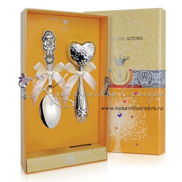 Серебро 925 пробы. Фабрика серебра "Аргента". В набор входят: ложка чайная"Девочка", погремушка "Сердце".