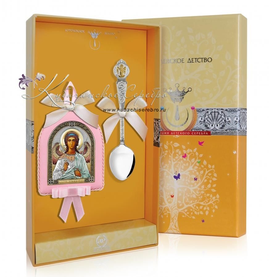 Детский набор состоит из серебряной ложки "Ангел-Хранитель" 925 пробы с позолотой и с иконой "Ангел Хранитель". Икона изготовлена по технологии вакуумного напыления серебра, основа - МДФ. Такой набор станет отличным подарком на рождение ребенка или крестины. Фабрика серебра "Аргента".