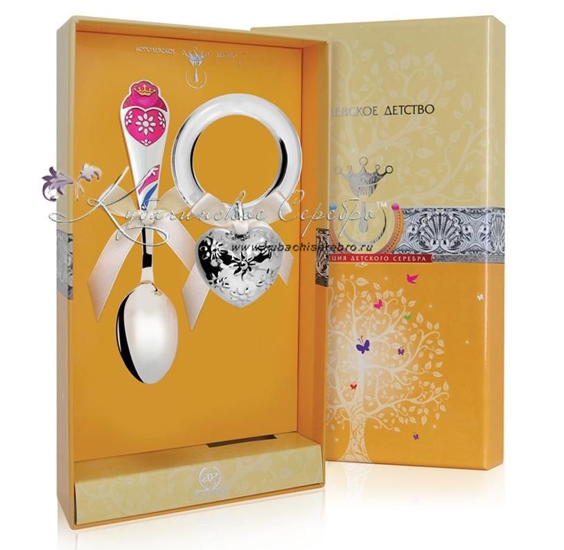 Серебро 925 пробы, с эмалью. В набор входят: ложка детская "Сердечко" КД, погремушка "Сердце с цветами на кольце". Фабрика серебра "Аргента".