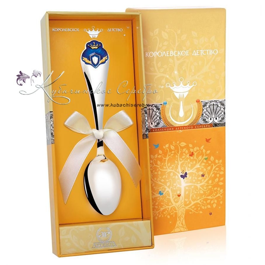 Серебро 925 пробы. С позолотой и эмалью. Фабрика серебра "Аргента". На ложечке изображен королевский герб, в котором можно сделать гравировку.