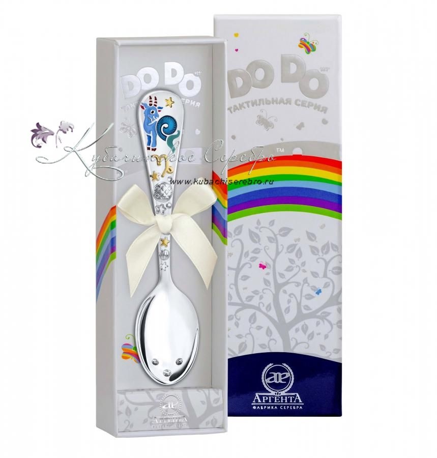 Серебро 925 пробы, цветная эмаль, позолота. Фабрика серебра "Аргента". Тактильные развивашки DO DO - инновационный продукт, разработанный Фабрикой серебра «АргентА» совместно с ведущими специалистами в области логопедии, дефектологии и детской психологии. Тактильная серия DO DO одобрена педиатрами России и получила официальные заключения специалистов: она действительно способствует раннему развитию малышей. Приятный на ощупь специальный рельеф с выпуклыми элементами на черенке и яблочке ложки (и других изделиях) способствует развитию мелкой моторики малыша. Эти элементы легко массируют губы и язык ребёнка во время кормления или игры, развивают вкусовые рецепторы, мимические и артикуляционные мышцы, способствуют раннему развитию речи. Яркая цветная эмаль стимулирует эстетическое развитие ребёнка, а также привлекает внимание и повышает аппетит. Проработанный до мельчайших деталей дизайн подготавливает руку ребёнка к последующему овладению письмом и обучению в школе. DO DO - это настоящий праздник ощущений для м