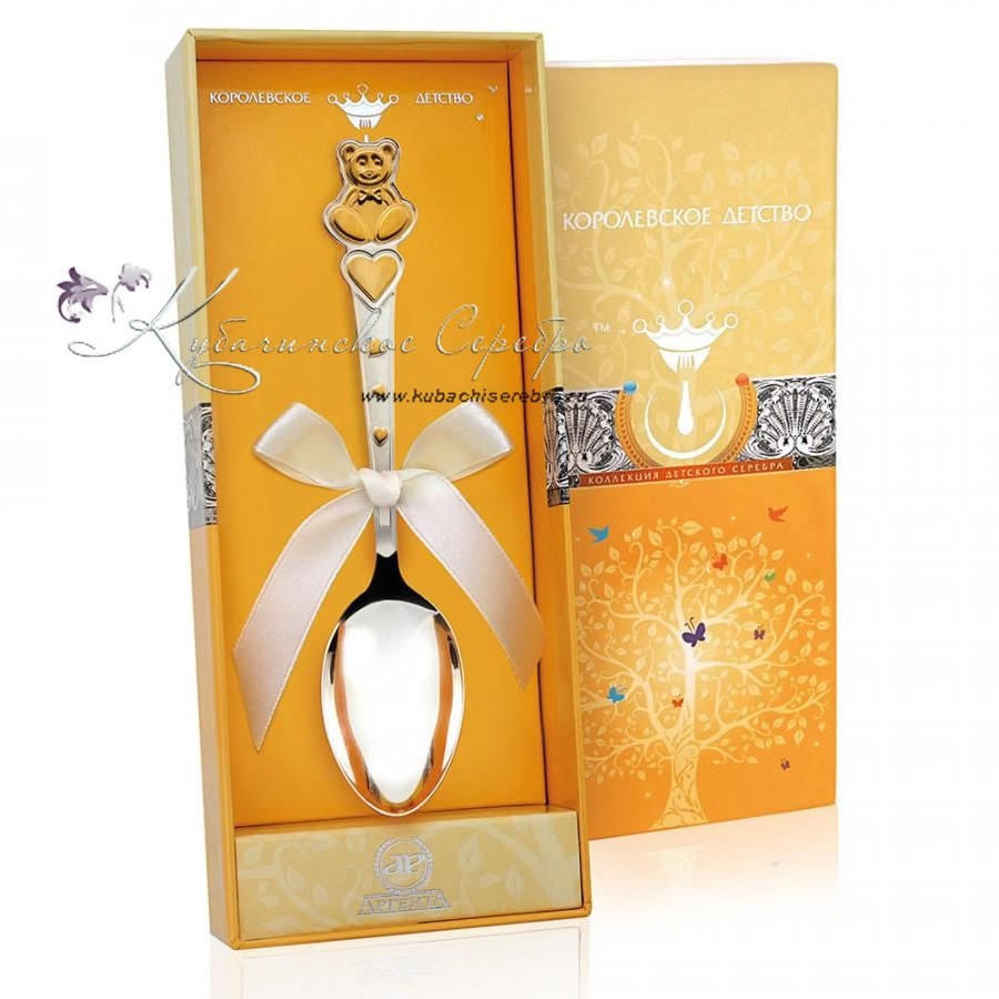 Детская серебряная ложка "Мишка с сердечками" с позолотой, арт №2774