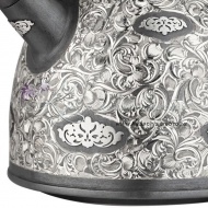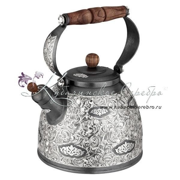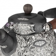 Серебро 875 пробы. Вставки - выпеленные узоры, дерево дуб, Чайник можно использовать на электроплите или на газовой плите с использованием рассеивателя.