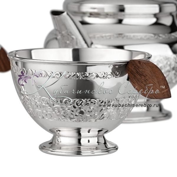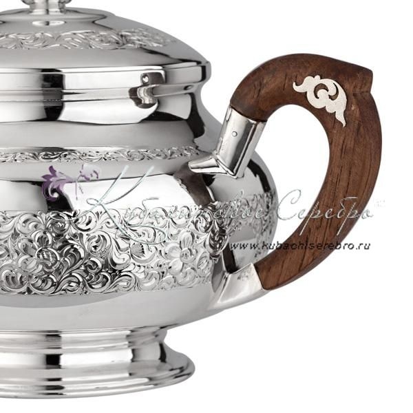 Серебро 875 пробы. В набор входят: чайник и две чашки. Вставки - дерево дуб.