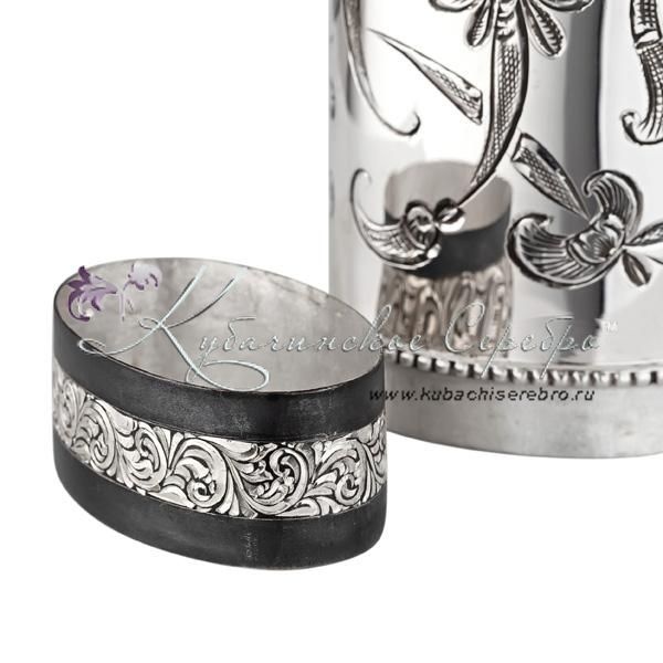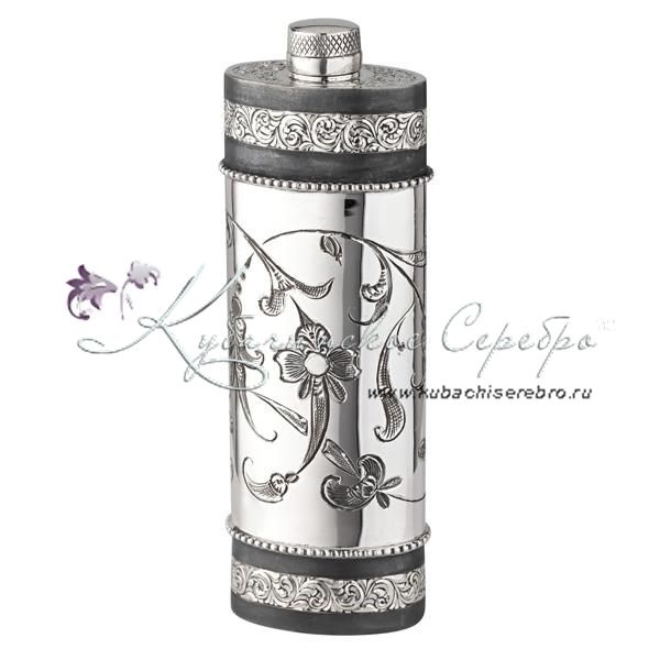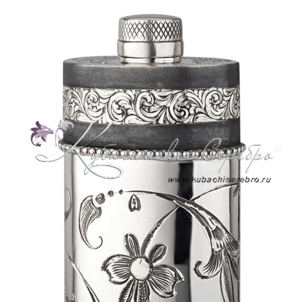 Серебро 875 пробы. Частично покрыта оксидированием. Нижняя часть фляги снимается. Фляга со сьемной стопкой.
