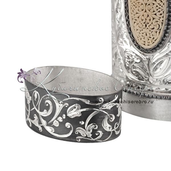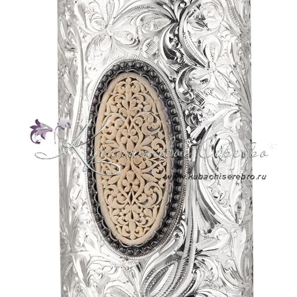 Серебро 875 пробы. Вставка - восстановленная слоновая кость. Частично покрыта оксидированием. Нижняя часть фляги снимается. Фляга со сьемной стопкой.