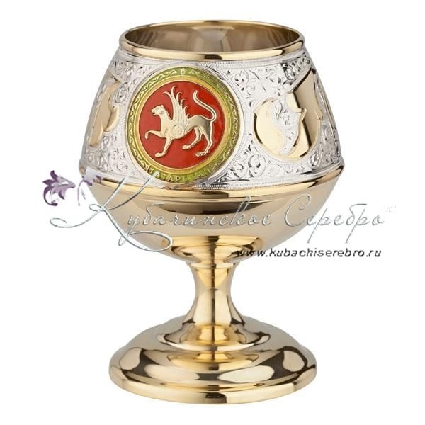 Серебро 875 пробы. Покрыт позолотой 999 пробы. На бокале изображен герб Республики Татарстан. Выполнено вручную кубачинскими мастерами!