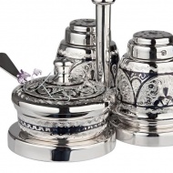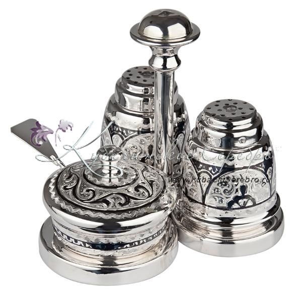 Серебро 875 пробы. В набор входят сольница, перечница, соусница и лопаточка. Прекрасное дополнение к любому столу! Серебряный набор для специй от кубачинских ювелиров. Гарантия высшего качества от фирменного магазина!