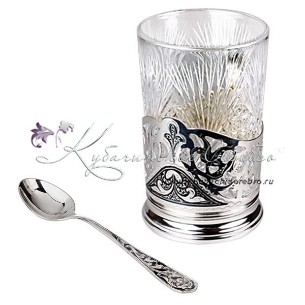 В набор входят подстаканник из серебра 875 пробы , ложка 925 пробы. Стакан в комплекте. Подобрать подстаканник и ложку вы можете так же самостоятельно.