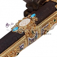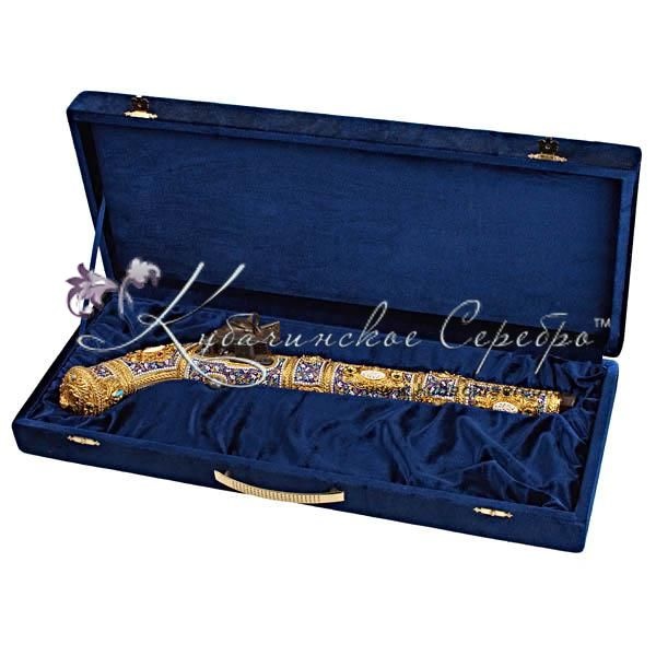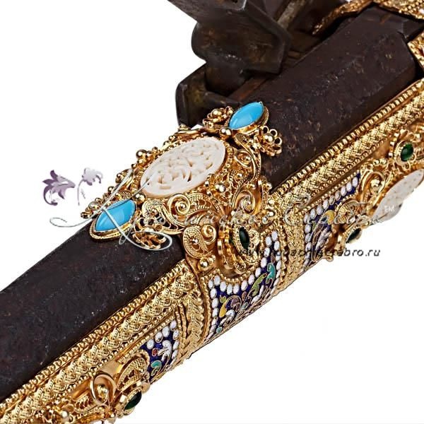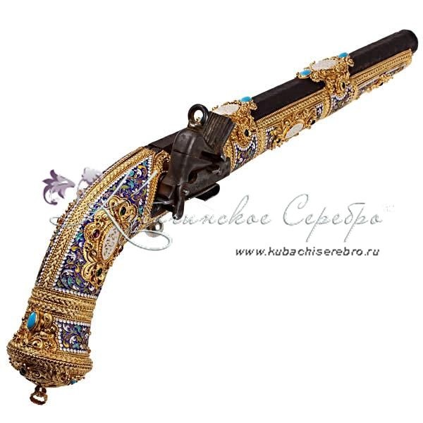 Серебро 875 пробы. Покрыт позолотой 999 пробы, слоновая кость, бирюза, филигрань и горячая эмаль! Старинный пистолет инкрустирован кубачинскими ювелирами . А если есть порох то можно и пальнуть)