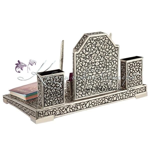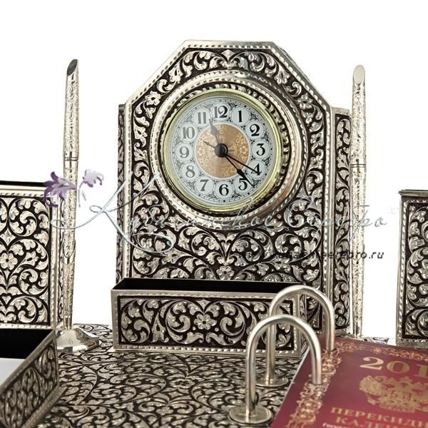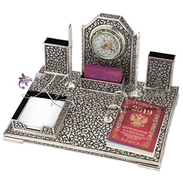 Серебро 875 пробы. Выполнен на подставке, с удобным держателем для визиток, настольные часы, подставка под перекидной календарь, подставки для буклетов, стаканчики для карандашей, ножниц и ручек, ручки в комплекте. С помощью такого аксессуара можно поздравить сотрудников, руководство, деловых партнёров.