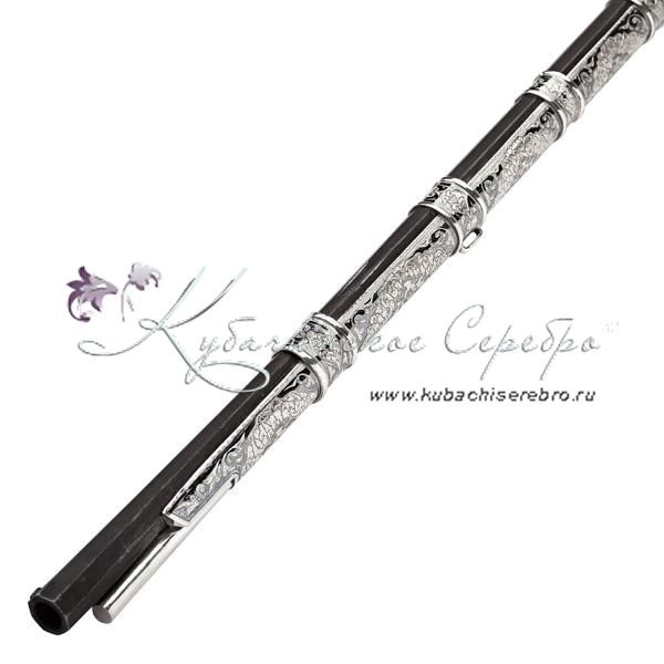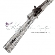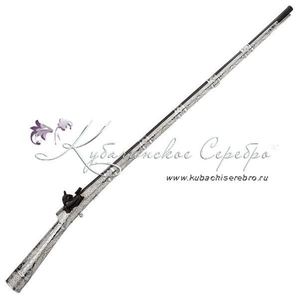 Серебро 875 пробы. Длина ствола-102 см. Ствол стальной, восьмигранный, с небольшим утолщением в казенной части. У казны, сверху, украшен тонким каемочным орнаментом с пятиугольной пальметой- клеймом в технике золотой насечки.Замок ударно-кремневый испано-мавританского типа, без украшений. Ложе и приклад ружья изготовлены из серебра. Украшены композициями кубачинских растительных орнаментов "лум" и "мархарай" в технике глубокой гравировки на конфаренном фоне и черновыми узорами вокруг них. Ложе скреплено со стволом пятью прямоугольными хомутами с гравировкой и чернью. Затыльник приклада окаймлен полосками ложной зерни. Ствол ружья и замок изготовлены мастерами селения Харбук в середине 19 века. Оправа ружья работы современных кубачинских оружейников, известных во всем мире как непревзойденные мастера, украшения холодного и огнестрельного оружия. Ружье является изделием современного дагестанского декоративно-прикладного искусства.
