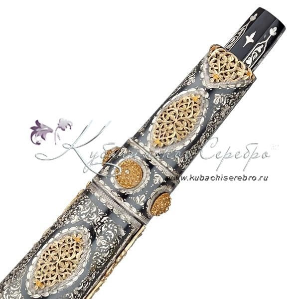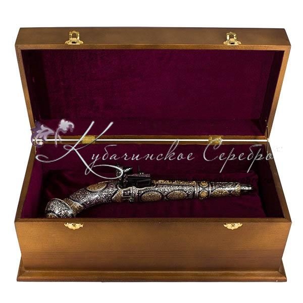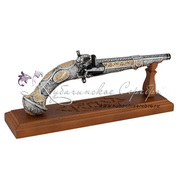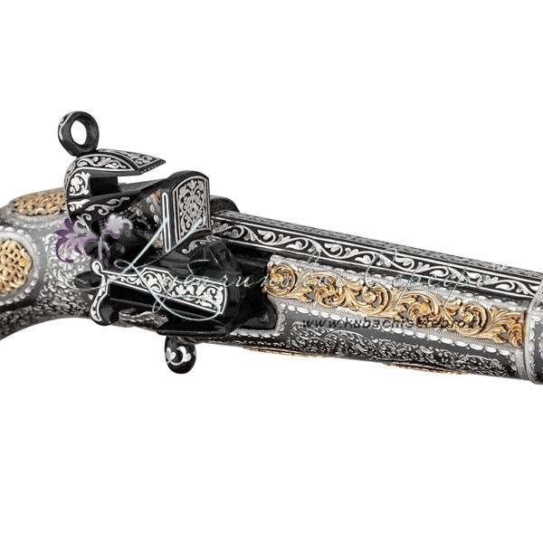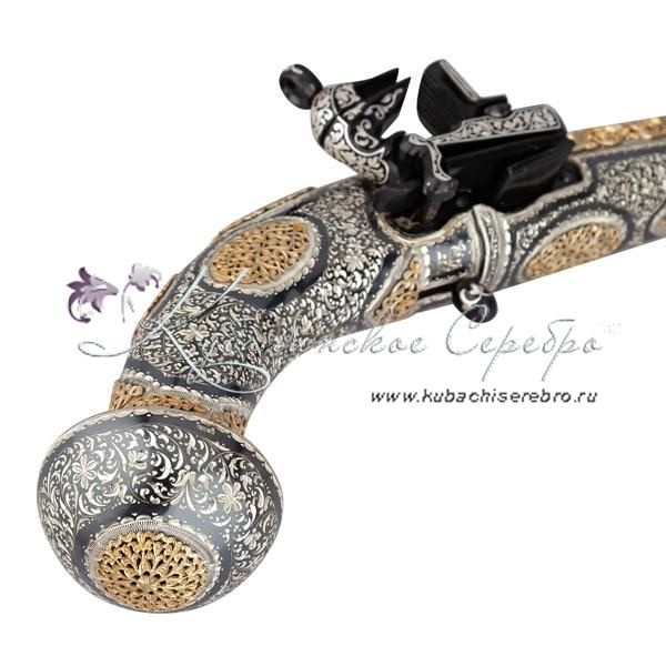 Серебро 875 пробы. Позолоченные накладки 999,9 пробы. Кремневый пистолет, дуэльный. На насечке присутствует орнамент по металлу серебром, так же есть дополнительная гравировка мелким орнаментом.