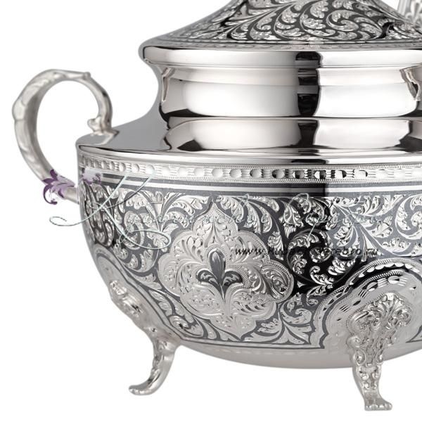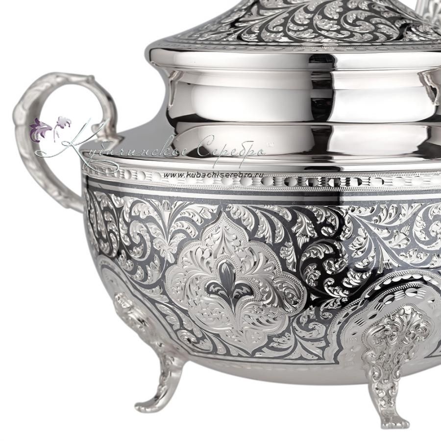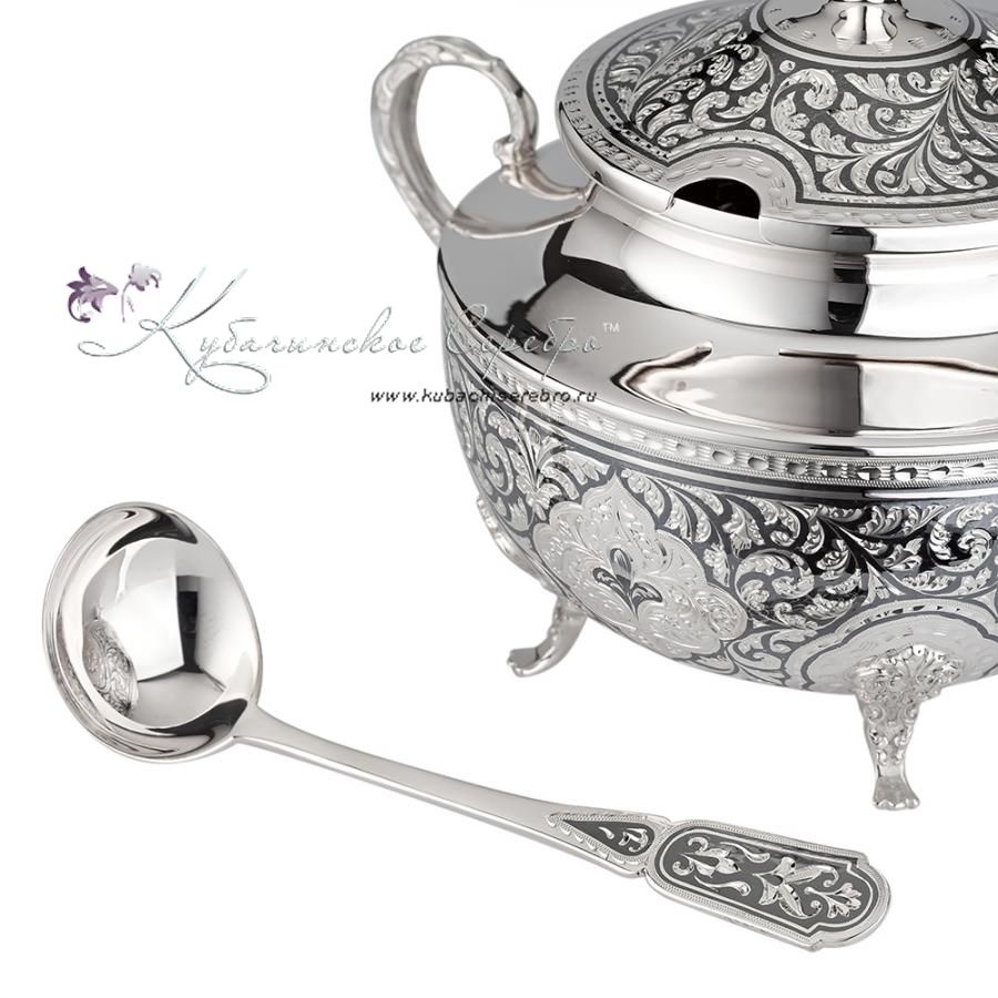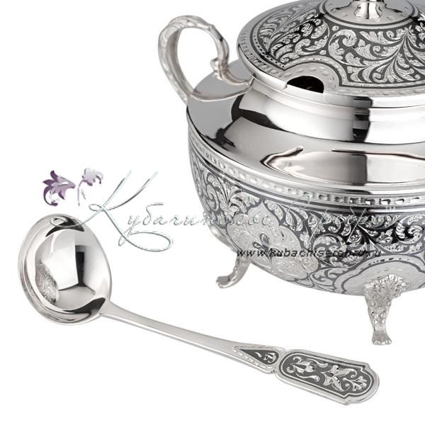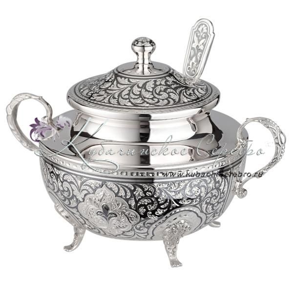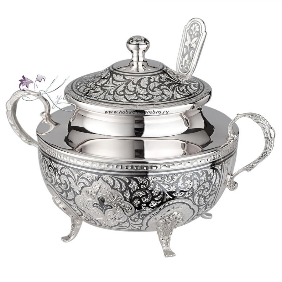 Серебро 875 пробы. В набор входят: сахарница объемом 500 мл и ложка.