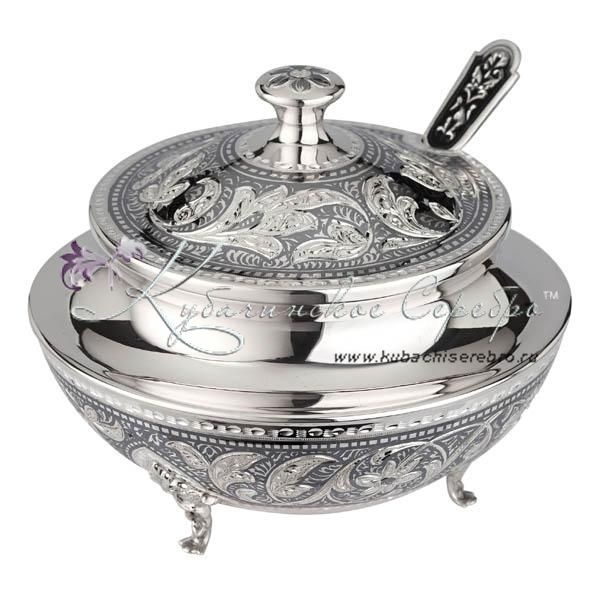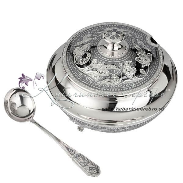 Серебро 875 пробы. В набор входят: сахарница объемом 500 мл и ложка.