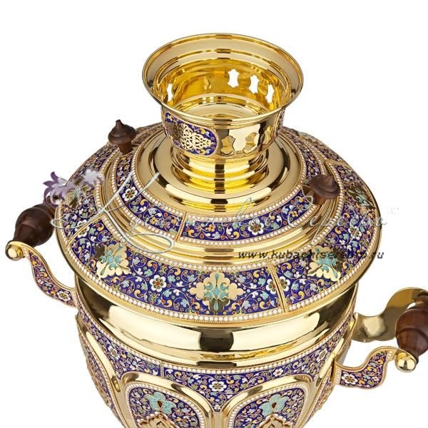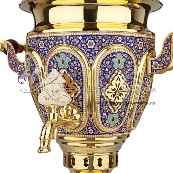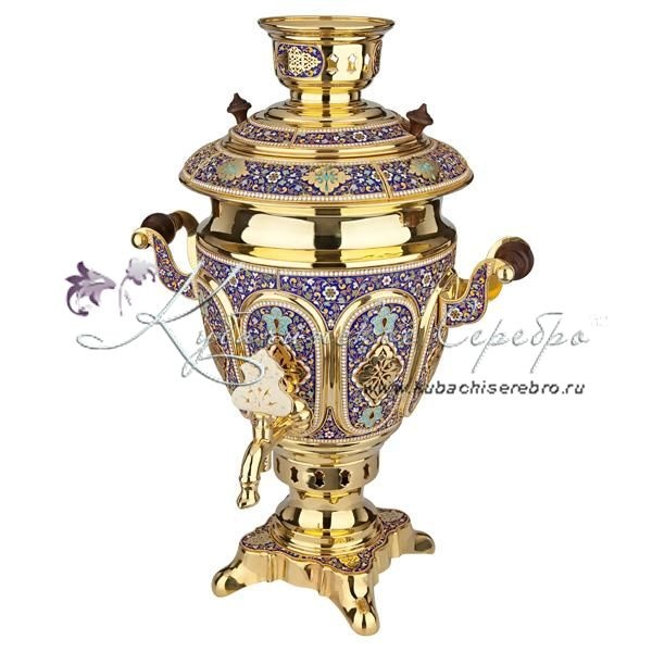 Серебро 875 пробы, покрыт позолотой 999 пробы. Самовар электрический, вставки - горячая эмаль. Гарантия высшего качества от фирменного магазина!