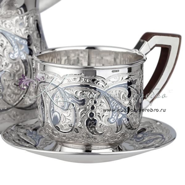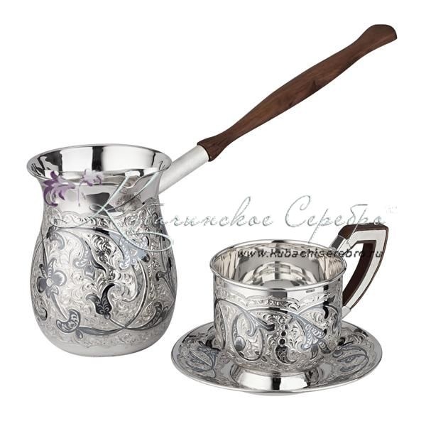 Серебро 875 пробы. Кофеварка с деревянной ручкой для вашего удобства и одна кофейная пара. Гарантия высшего качества!