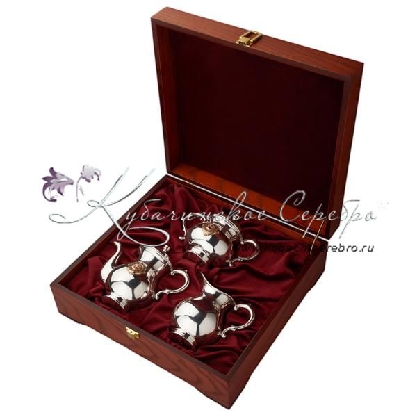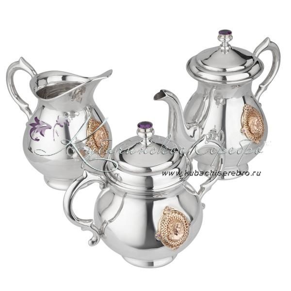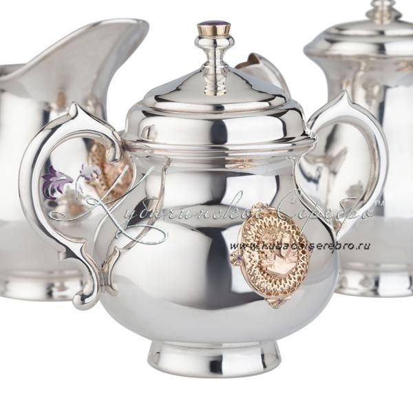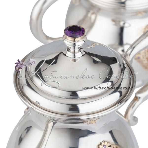 Серебро 925 пробы. В набор входят: чайник, сахарница, молочник. Камень на крышке - аметист. Гарантия высшего качества от фирменного магазина!
