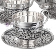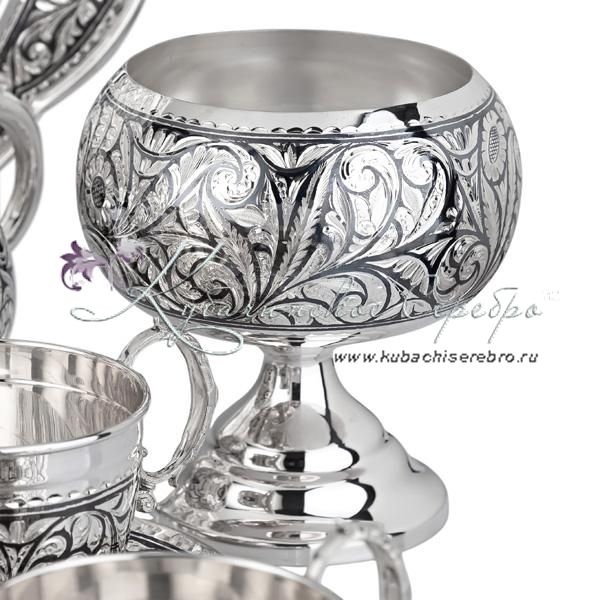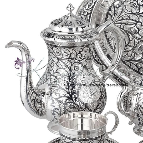 Серебро 875 пробы. В сервиз входят: кофейник, чайник, сахарница, вареньица, поднос, 6 пар чашек с блюдцем. Гарантия высшего качества от фирменного магазина!
