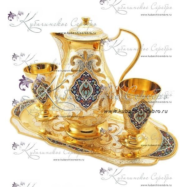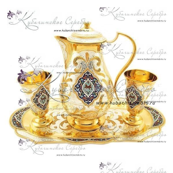 Серебро 875 пробы. Покрыт позолотой 999 пробы. В набор входят: кувшин, поднос и 2 бокала. Гарантия высшего качества от фирменного магазина!