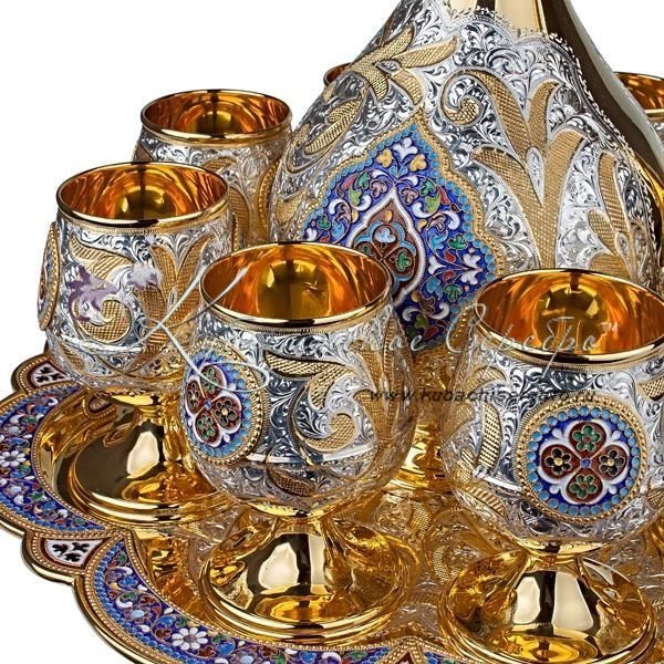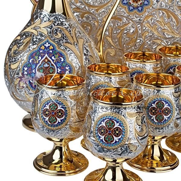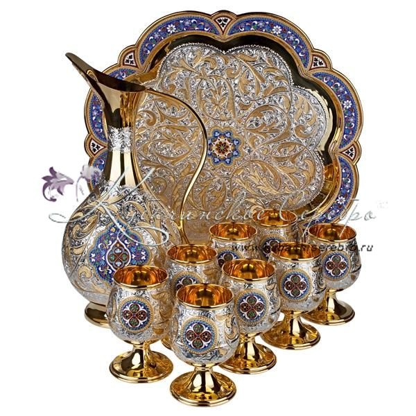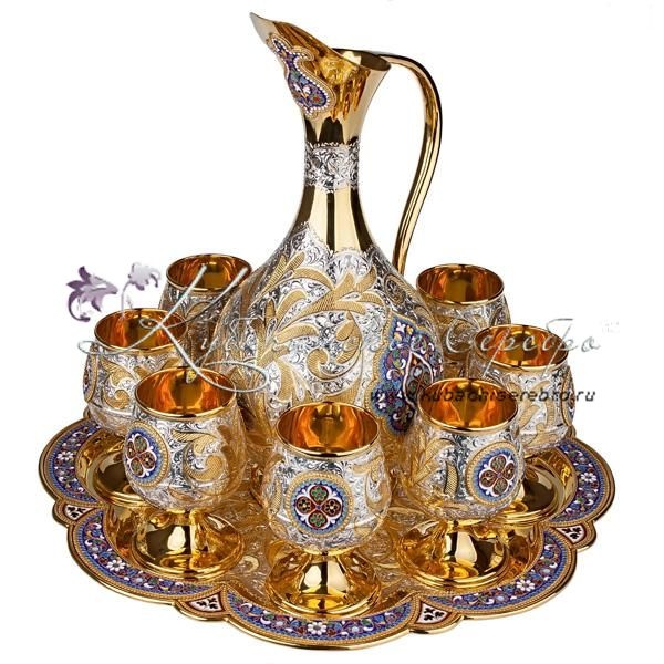 Серебро 875 пробы. Покрыт позолотой 999 пробы. В сервиз входят: кувшин, поднос и 8 бокалов.