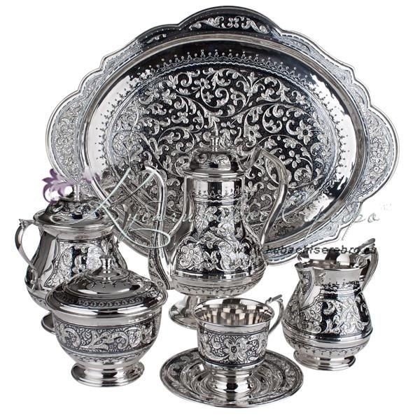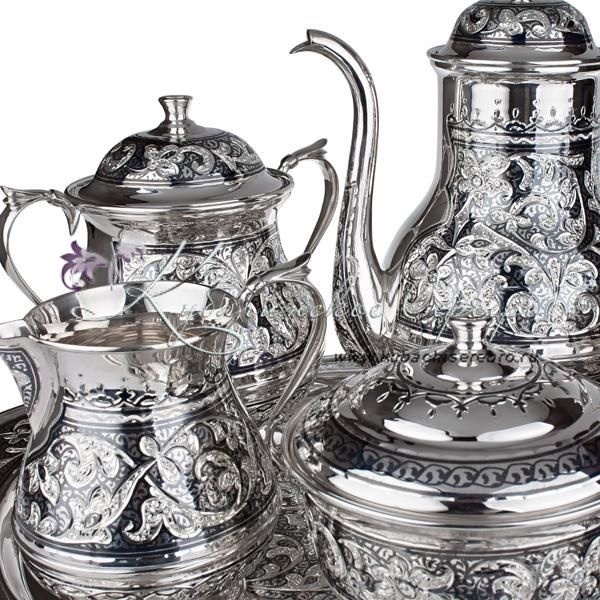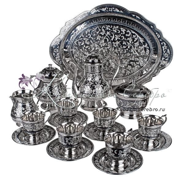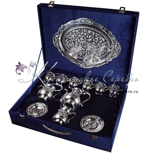 Серебро 875 . В премиумном исполнении от кубачинских мастеров ! В сервиз входит - чайник , поднос , чашки с блюдцем 6 пар, молочник , сахарница , конфетница.