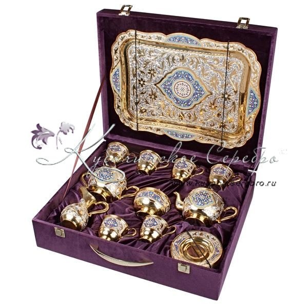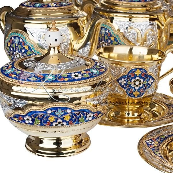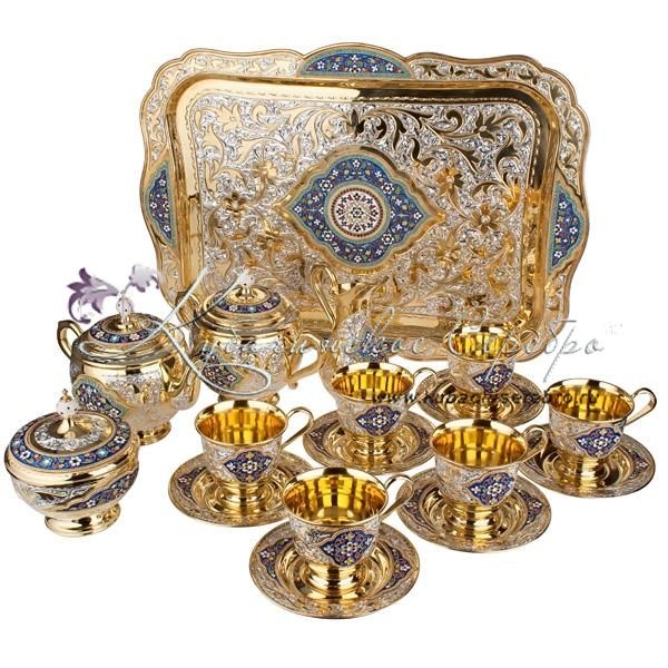 Серебро 875 пробы, покрыт позолотой 999 пробы.. В исполнении с цветной горячей эмалью! В сервиз входят : поднос ,чайник, сахарница, конфетница, чашки с блюдцем 6 пар.