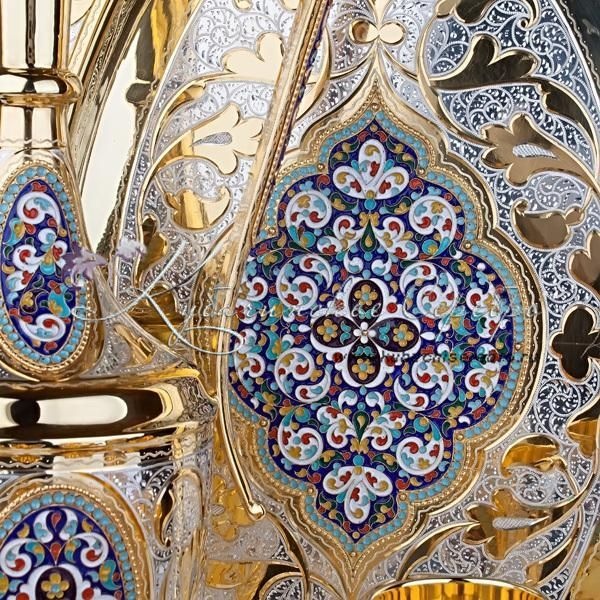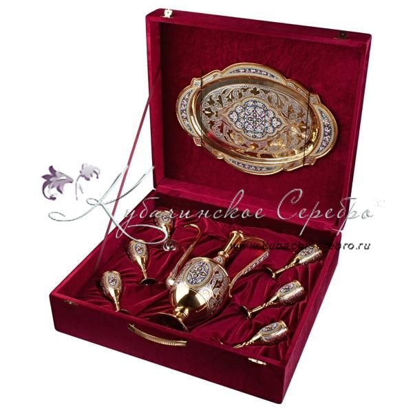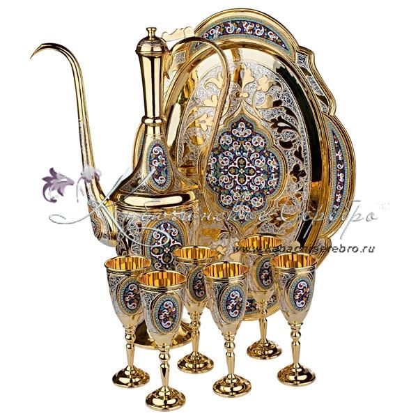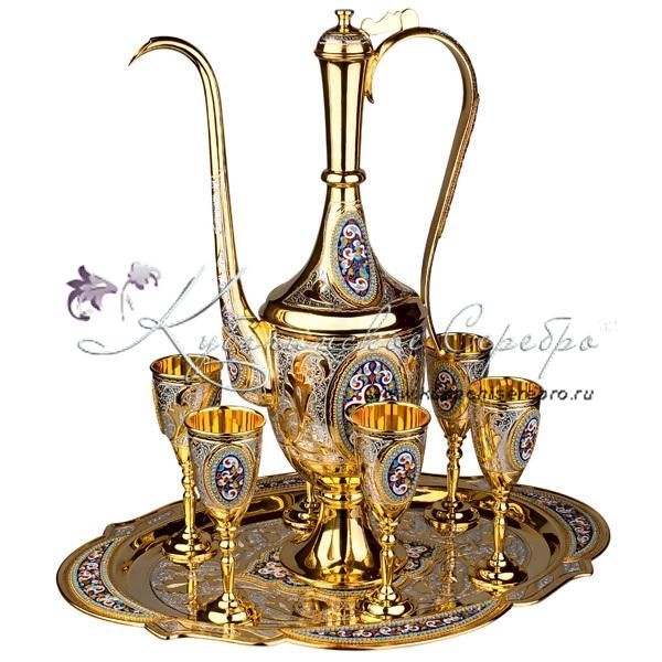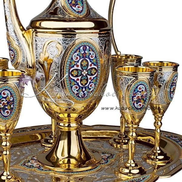 Серебро 875 пробы, покрыт позолотой 999 пробы. Исполнение с цветной горячей эмалью! В сервиз входят: кувшин, поднос и 6 бокалов.