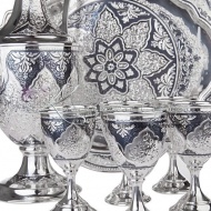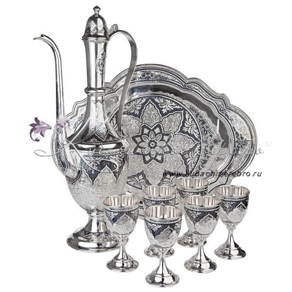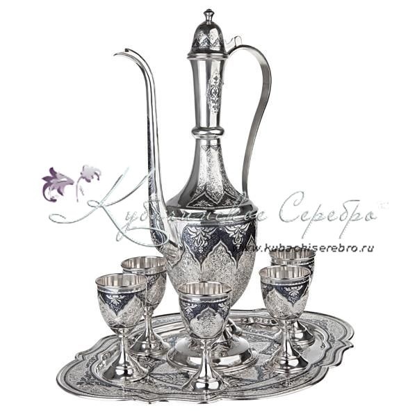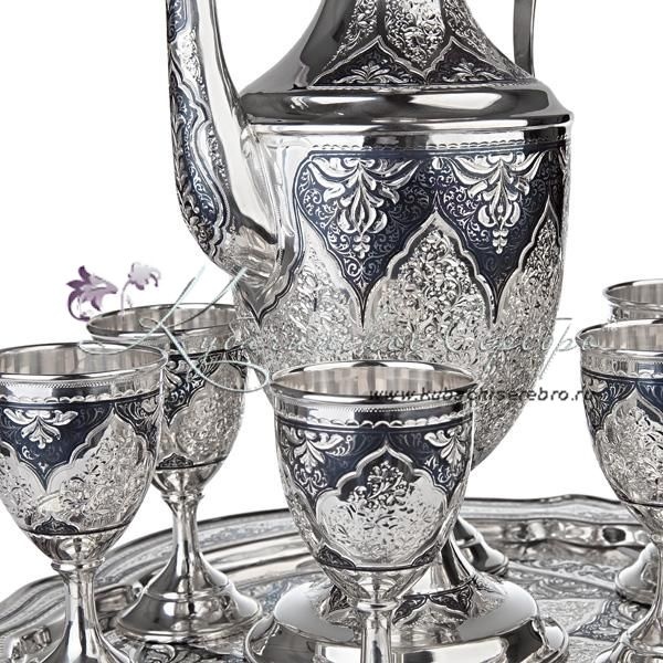 Серебро 875 пробы. В сервиз входит винный кувшин, поднос и 6 бокалов. .В люксовом исполнении от кубачинских ювелиров! Гарантия высшего качества от фирменного магазина!