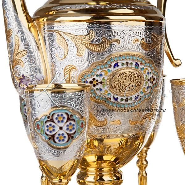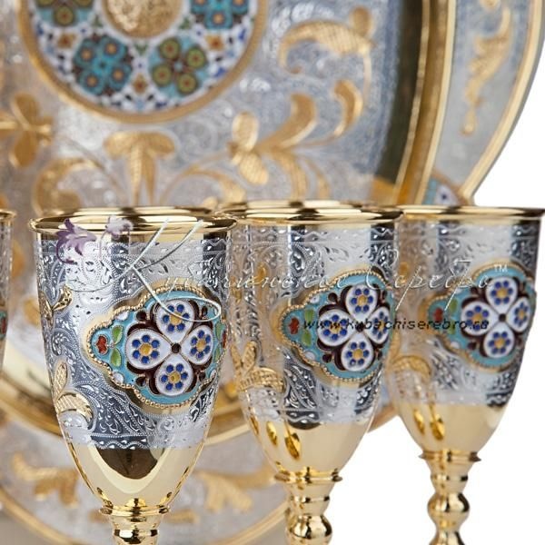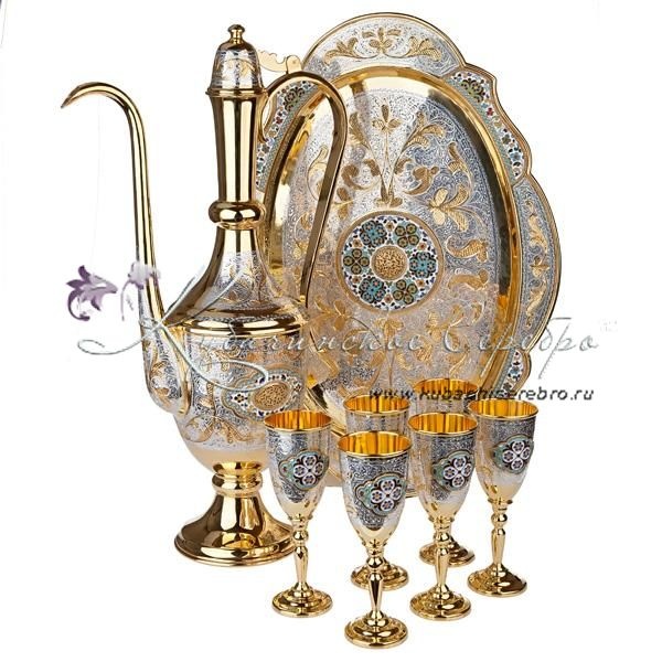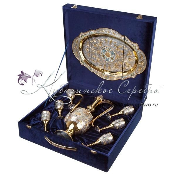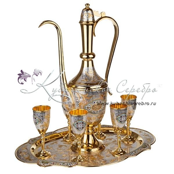 Серебро 875 пробы, покрыт позолотой 999 пробы. В сервиз входят: кувшин, поднос, 6 бокалов. Гарантия высшего качества от кубачинских ювелиров!