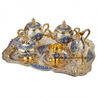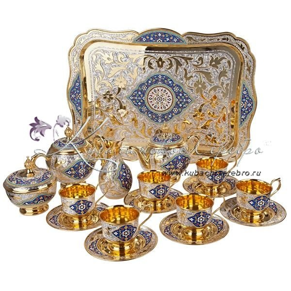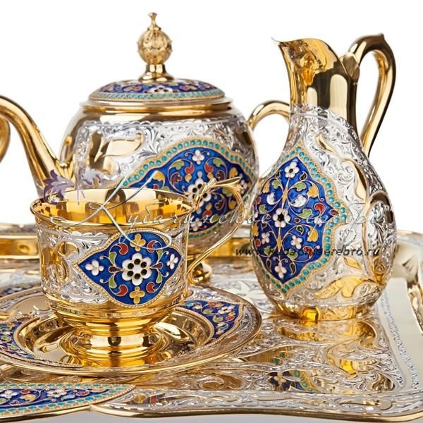 Серебро 875 пробы. Покрыт позолотой 999 пробы. В сервиз входят: чайник, сахарница, конфетница, молочник, 6 пар чашек с блюдцем, поднос.