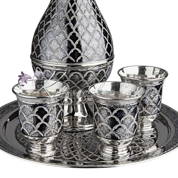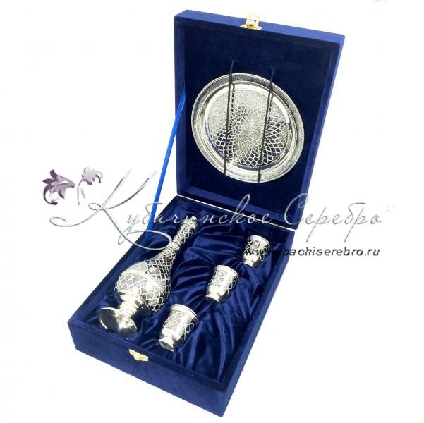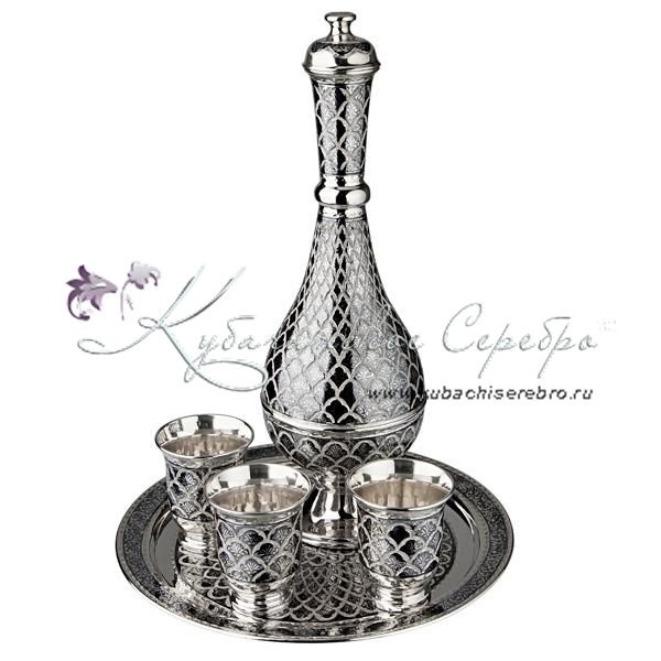 Серебро 875 пробы. В сервиз входят: поднос, графин и три стопки.