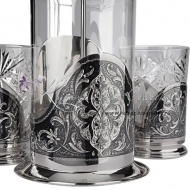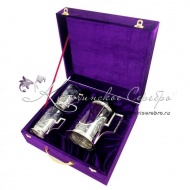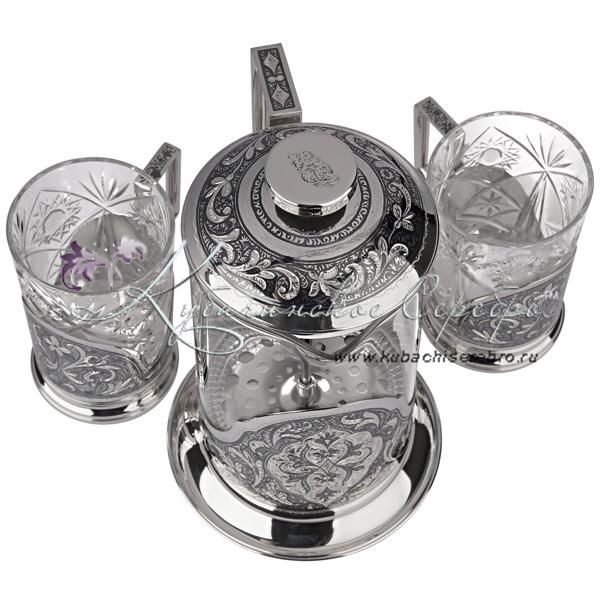 Серебро 875 пробы. В набор входят: заварочный чайник (френч-пресс) со стеклянной колбой из жаропрочного стекла и 2 подстаканника (стаканы в комплекте). Выполнено вручную кубачинскими ювелирами!