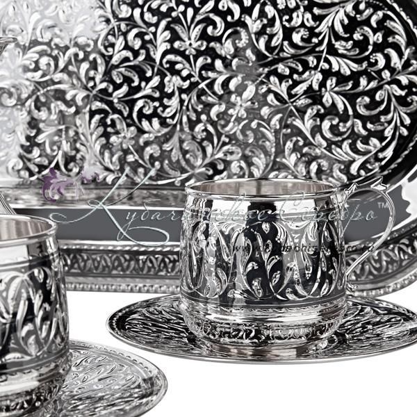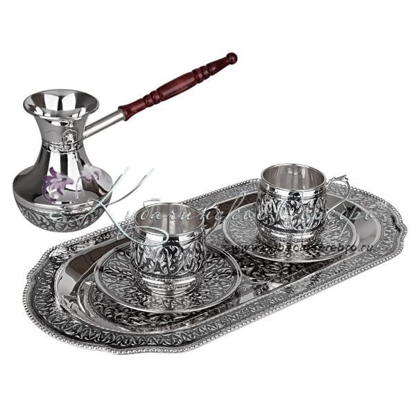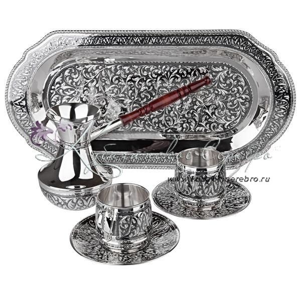 Серебро 875 пробы. В набор входят: поднос, турка и 2 кофейные пары. Гарантия качества от фирменного магазина!