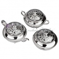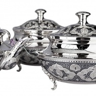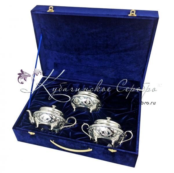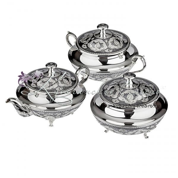 Серебро 875 пробы. В набор входят: чайник, сахарница и конфетница на ножках. Объем каждого изделия 500 мл.