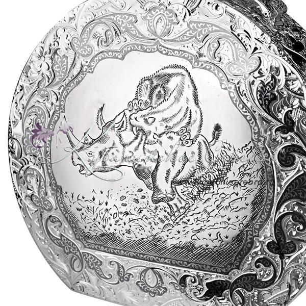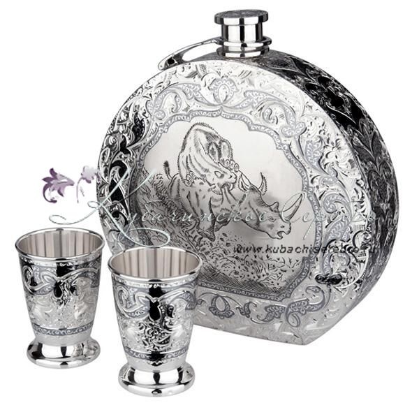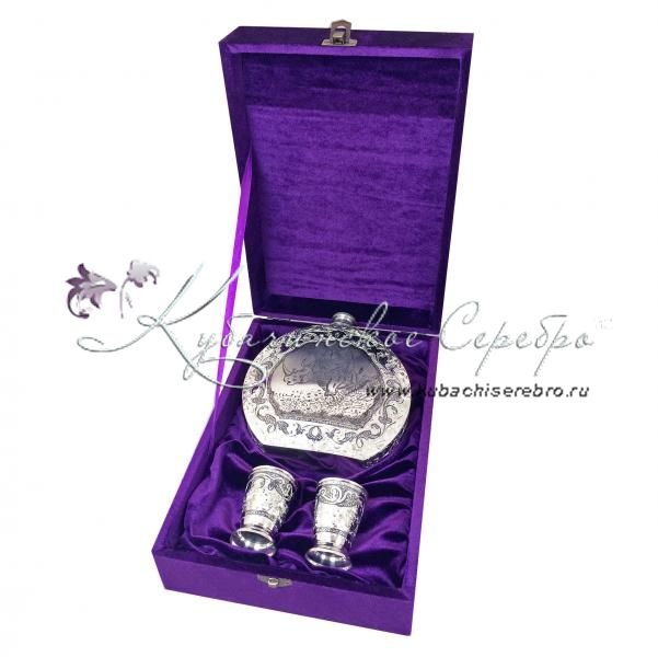 Серебро 875 пробы. В набоор входят: фляга и 2 стопки.