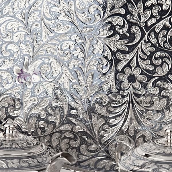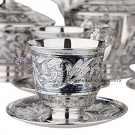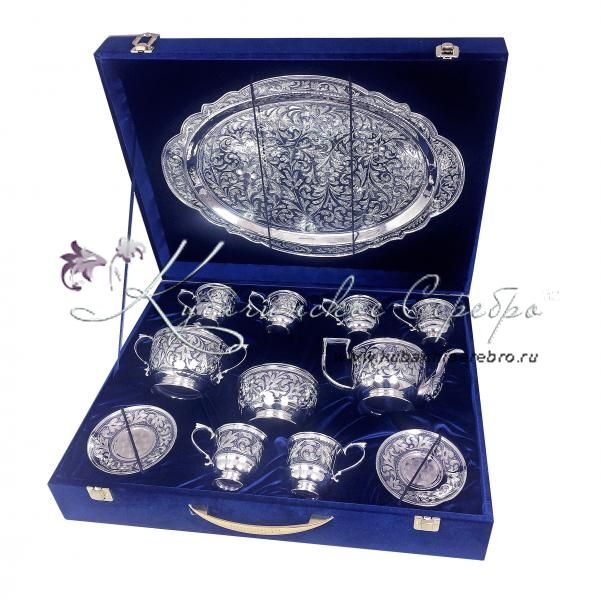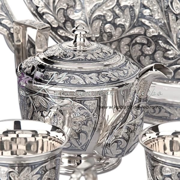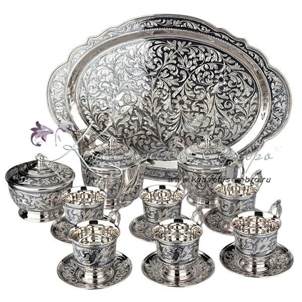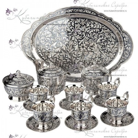 Серебро 875 пробы. В сервиз входит - поднос , чашки с блюдцем 6 пар, чайник, сахарница , конфетница.