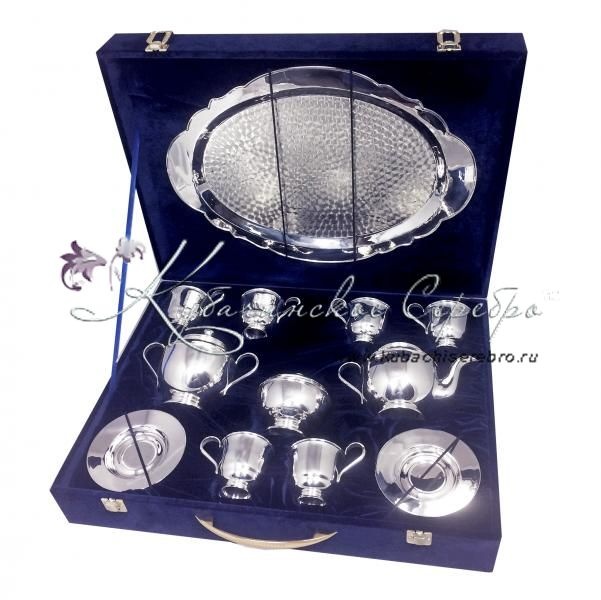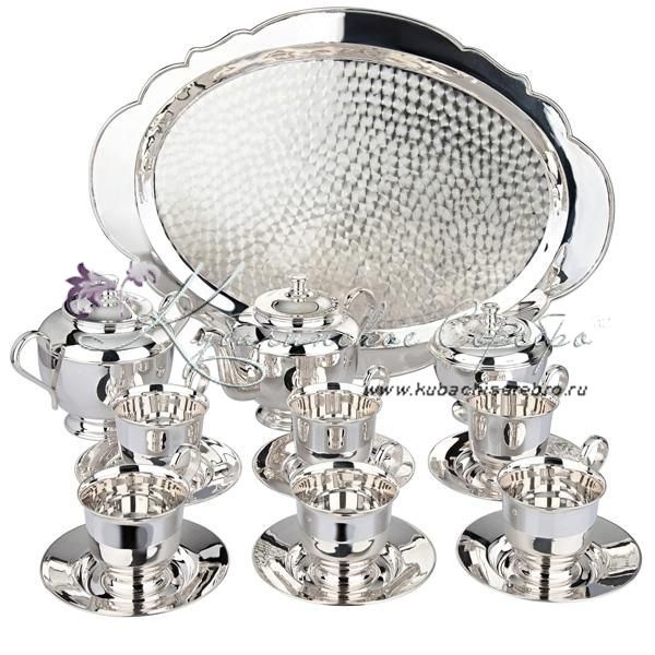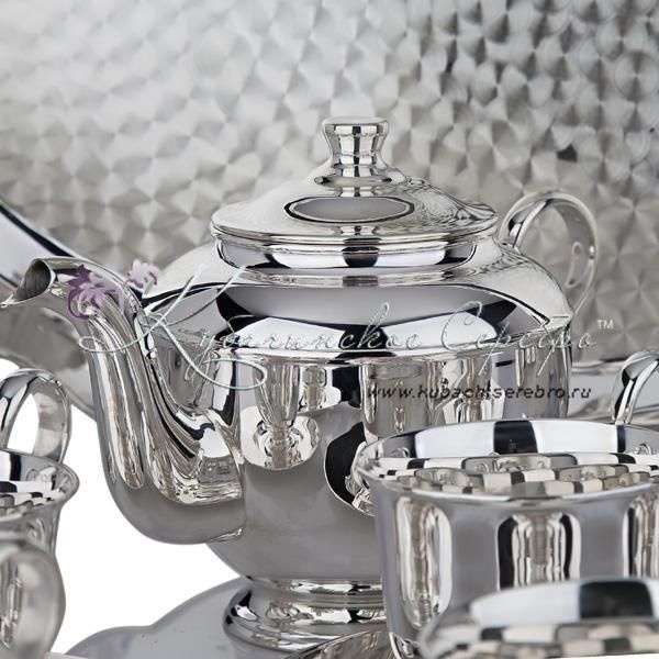 Серебро 875 пробы. В сервиз входят: чайник, сахарница, конфетница, поднос, 6 пар чашек с блюдцем. Возможно нанесение подарочной надписи или любого рисунка.