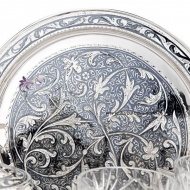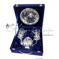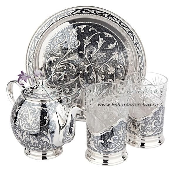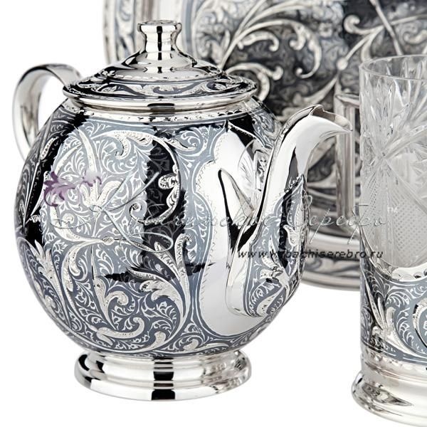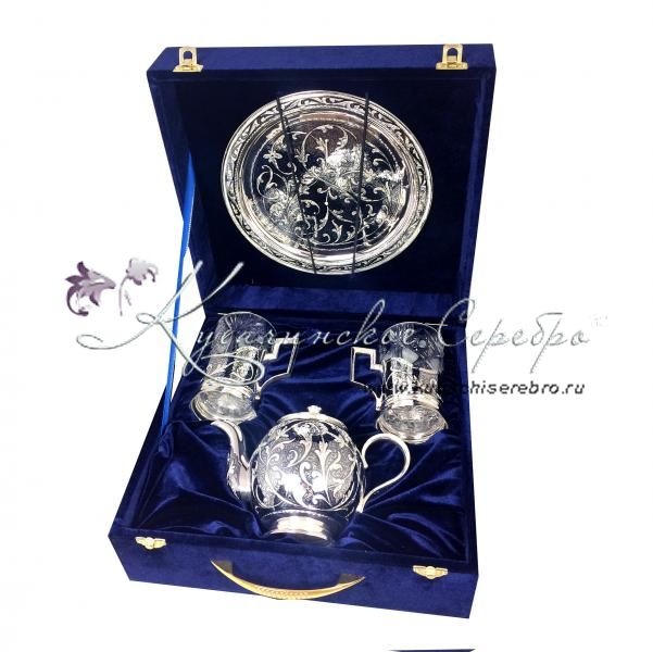 Серебро 875 пробы. В набор входят: чайник, два подстаканника и поднос. Стаканы в комплекте.
