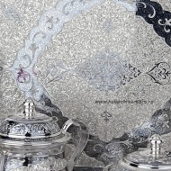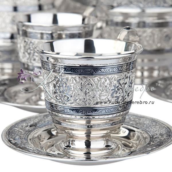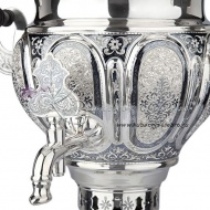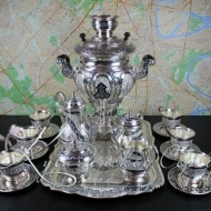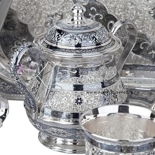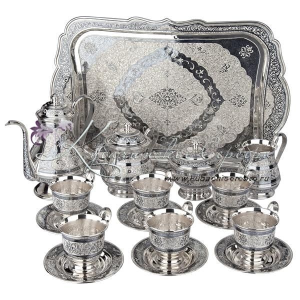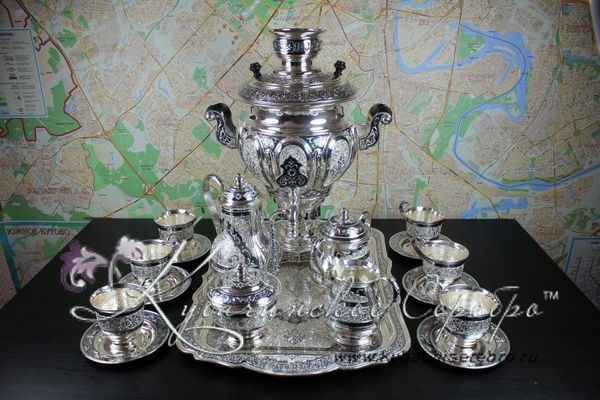 Серебро 875 пробы. В премиумном исполнении от кубачинских мастеров ! В сервиз входят - самовар электрический, чайник , поднос , чашки с блюдцем 6 пар, молочник , сахарница , конфетница.
