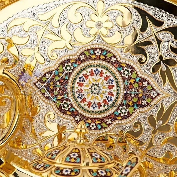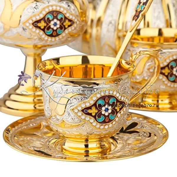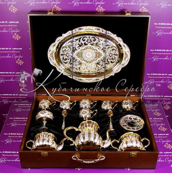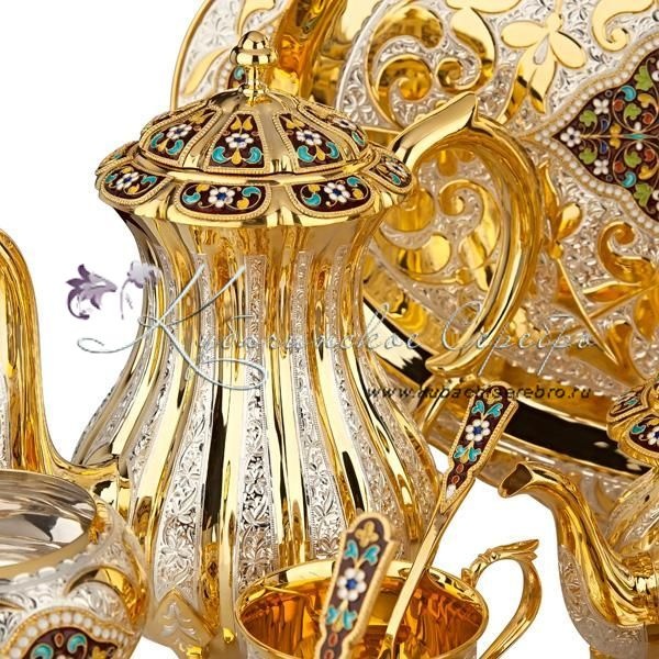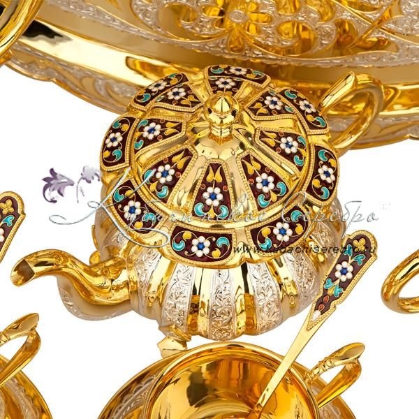 Серебро 875 пробы. Покрыт позолотой 999 пробы.В сервиз входят : чайник, поднос ,чайник заварочный, сахарница, вареньица, чашки с блюдцем 6 пар, чайные ложки 6 штук. Гарантия высшего качества от фирменного магазина!