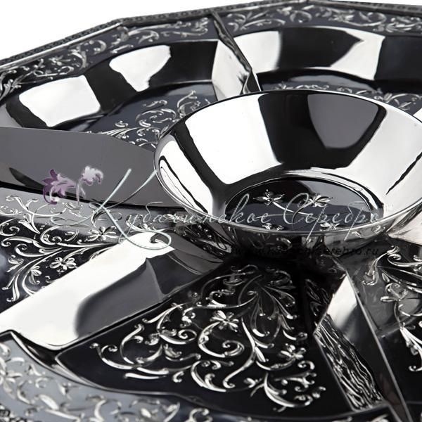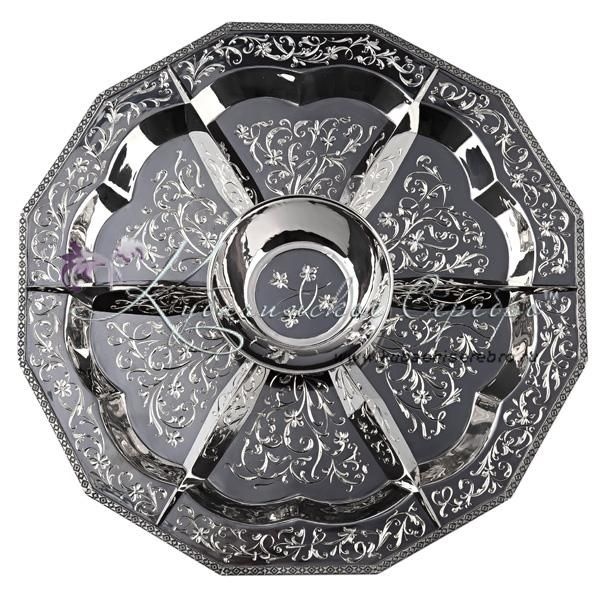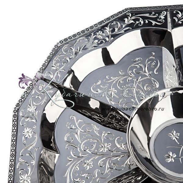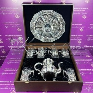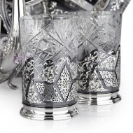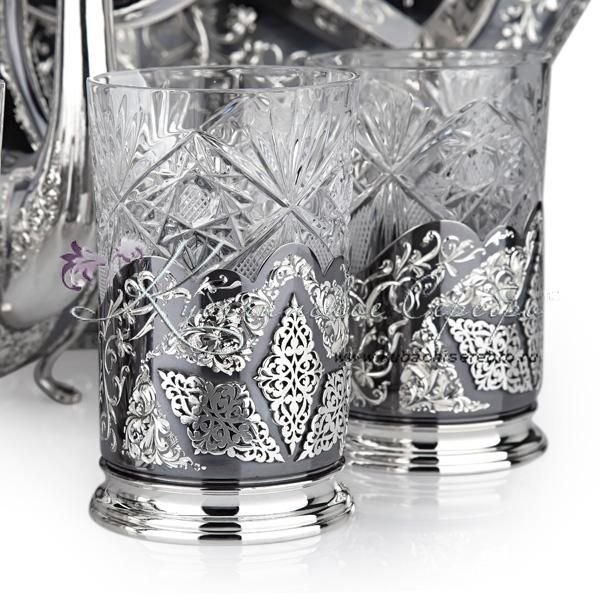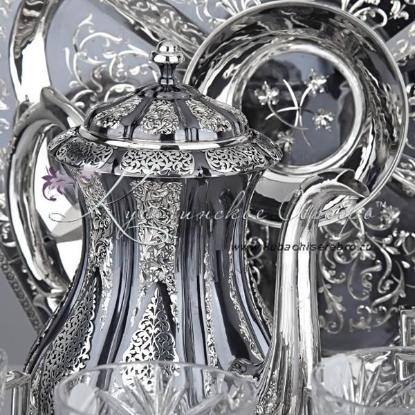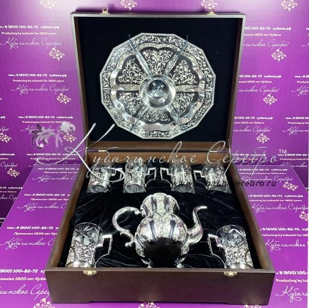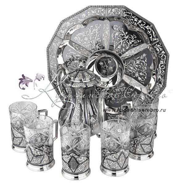 Серебро 875 пробы.В сервиз входят: чайник, поднос, подстаканники 6 шт. Стаканы в комплекте. Роскошный набор от кубачинских ювелиров! Гарантия высшего качества от фирменного магазина!