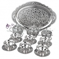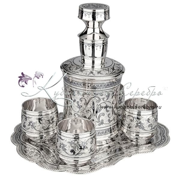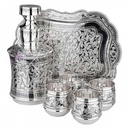 Серебро 875 пробы. В сервиз входят: графин, поднос, 4 стакана.В эксклюзивном исполнении от кубачинских ювелиров! Гарантия высшего качества от фирменного магазина!