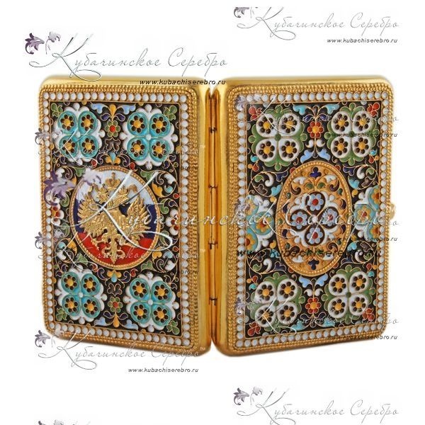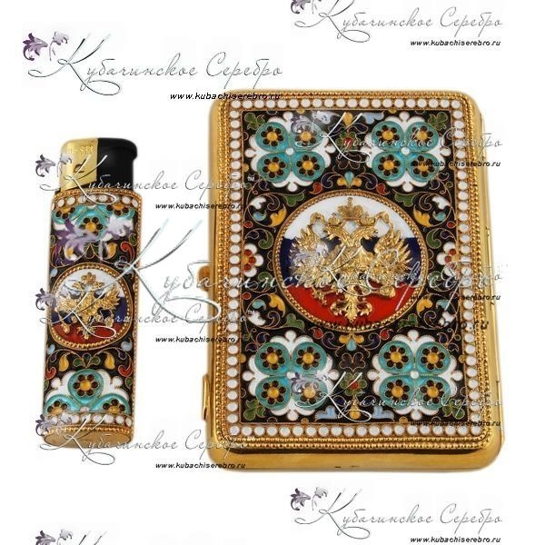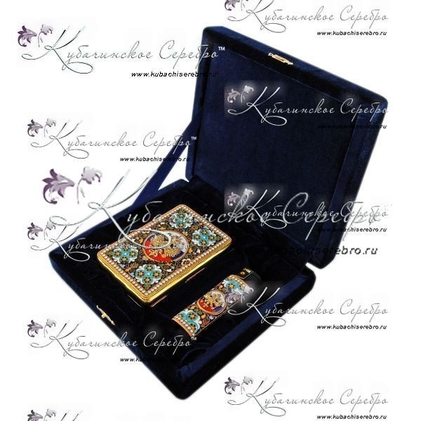Серебро 875 пробы, покрыт позолотой 999 пробы. В набор входят: футляр под зажигалку и портсигар с эмалью.