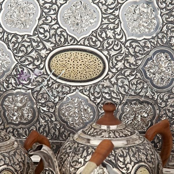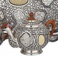 Серебро 875 пробы. Вставки- кость моржа, дерево кавказский дуб. В сервиз входят: чайник, сахарница, поднос, вареньица, конфетница, молочник, 6 пар чашек с блюдцем, чайные ложки 6 штук, щипцы. Роскошный набор от кубачинских ювелиров! Гарантия высшего качества от фирменного магазина!!