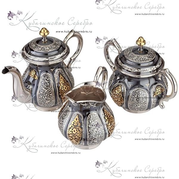 Серебро 875 пробы. С позолотой 999 пробы. В набор входят: чайник, сахарница, молочник. Гарантия высшего качества от фирменного магазина!