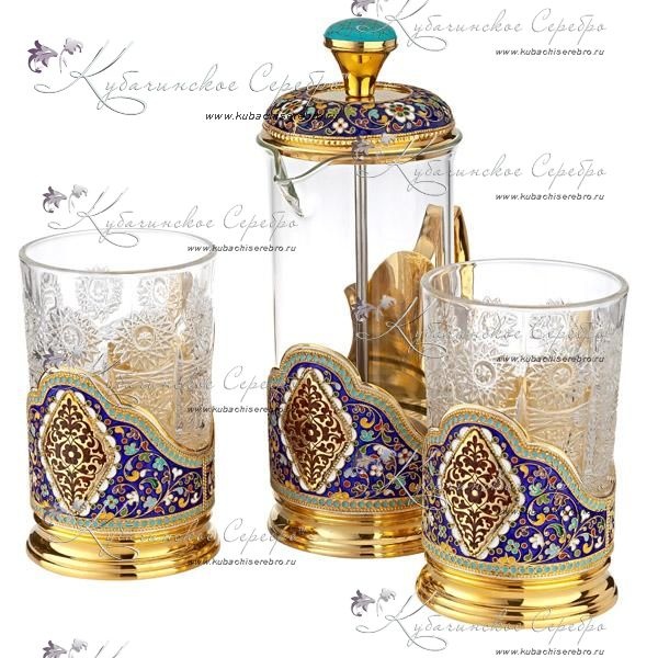 Серебро 875 пробы. Покрыт позолотой 999 пробы. В набор входят: заварочный чайник (френч-пресс) со стеклянной колбой из жаропрочного стекла и 2 подстаканника (стаканы в комплекте), крышка со вставкой-камень бирюза. Гарантия вышего качества от фирменного магазина!