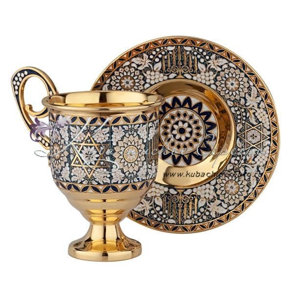 Серебро 925 пробы, с позолотой 999 пробы. С холодной эмалью. На изделии представлена звезда Давида и семисвечник менора.