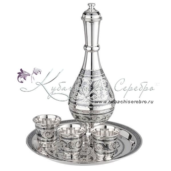 Сервиз из серебра 875 пробы, Для коньяка , водки, ликера .В сервиз входят: графин, поднос и три стопки. Великолепный серебряный сервиз от кубачинских ювелиров! Гарантия высшего качества от фирменного магазина!