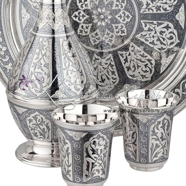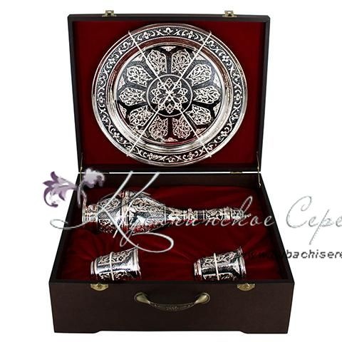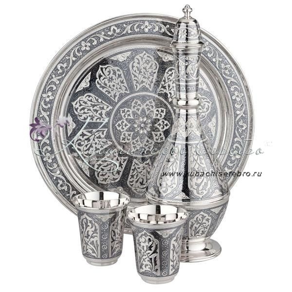 Серебро 875 пробы. Гарантия высшего качества от фирменного магазина! Изделие в деревянном футляре. Автор: Алмасов Курбан А. Член Союза Художников России. Заслуженный деятель искусств РД. Художник - ювелир. Данное изделие является продукцией, произведённой в высокогорном ауле Кубачи по традиционным древним методам обработки металла и является высокохудожественным произведением. При изготовлении этого набора использовались множество процессов техники изготовления кубачинского ремесла: монтировка, гравировка, чернь, полировка. дополнительная гравировка.